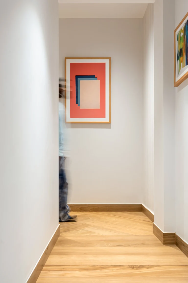 To evoke an art gallery experience, we designed a passage that introduces a sense of journey and subtle mystery. The walls along this corridor display artworks, making them an integral part of the arrival sequence. As one moves through, the space gradually opens up, revealing the full office and culminating in a view of the outdoor garden. This spatial narrative amplifies the presence of the client’s art collection and enhances the overall experience.