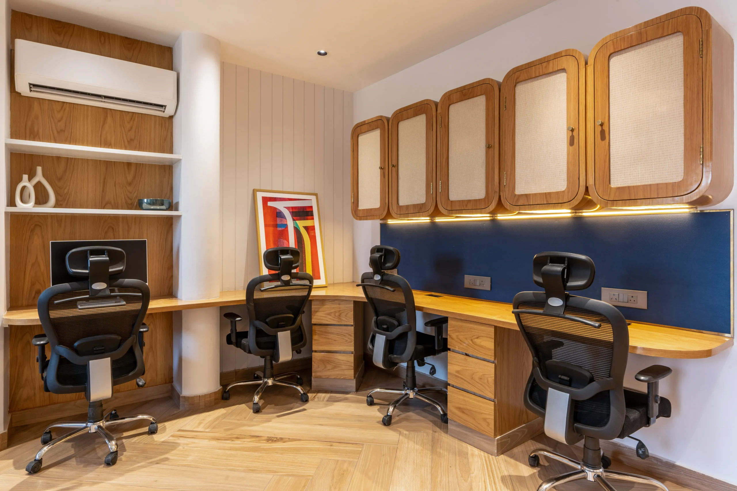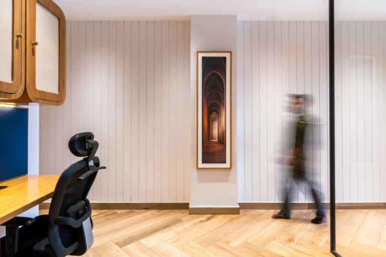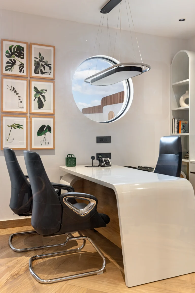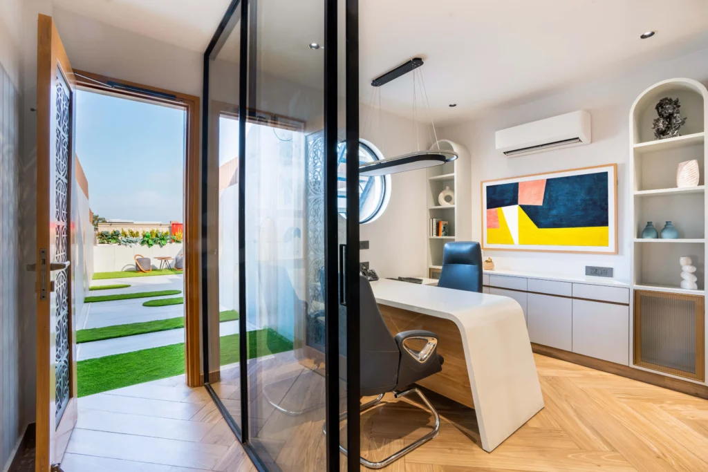 The Green Office reflects our commitment to innovative, sustainable design, blending natural elements with modern comfort to create an inspiring workspace. The client, an avid art collector, envisioned an office that would showcase his artworks while also offering a tranquil garden for client meetings and peaceful morning coffee. The goal was for the art to bring vibrant colour, with the interiors providing a subtle, supportive backdrop. The result is a calm, cohesive environment that balances art, nature, and refined personal taste.